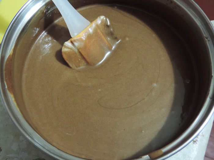 26. Перемешиваем до однородности, добавляем желатин. Вот такой непрезентабельный цвет готовой глазури. Если вы не планируете ее подкрашивать, то делайте из одного черного шоколада. Торт "Красное и черное"