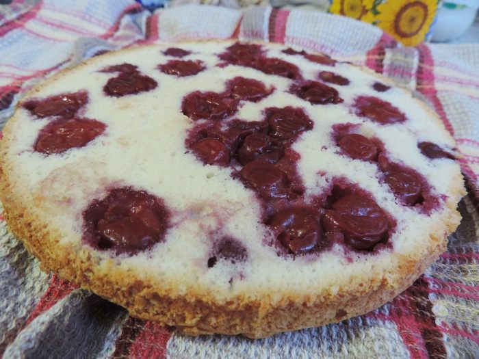 Форму диаметром 18 см выстилаем бумагой для выпечки, равномерно распределяем сверху вишню.