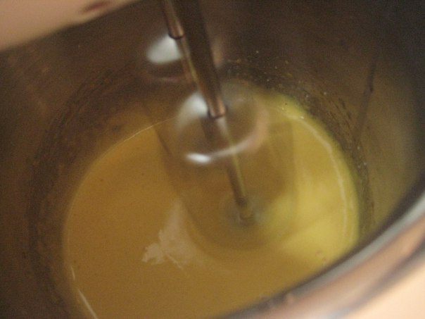 Немного горячего молока влить в яичную смесь, перемешать, всыпать муку, размешать. Струйкой влить оставшееся горячее молоко в яичную смесь, перемешать, перелить в сотейник, поставить на огонь.