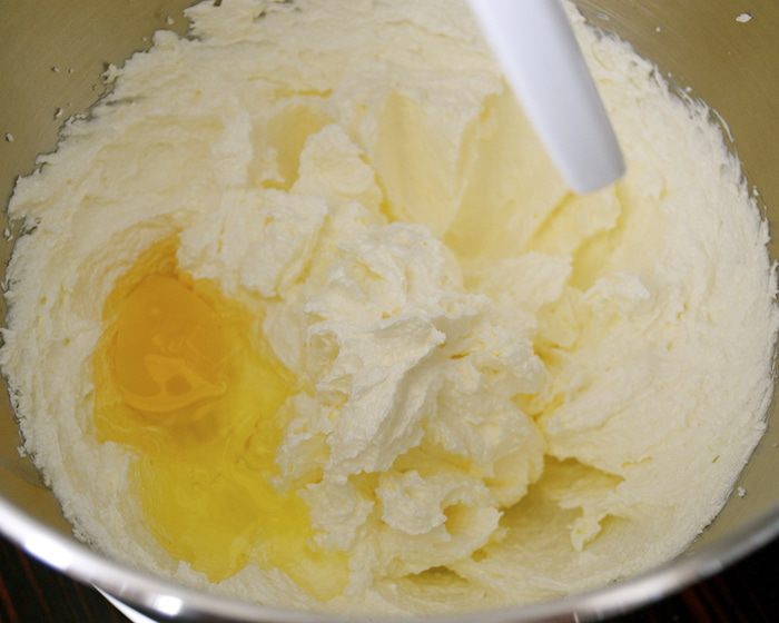 Взбейте сливочное масло с оставшимся сахаром, пока масса не станет воздушной. По одному добавьте яйца (не добавлять последующее яйцо, пока предыдущее не будет полностью вмешано).