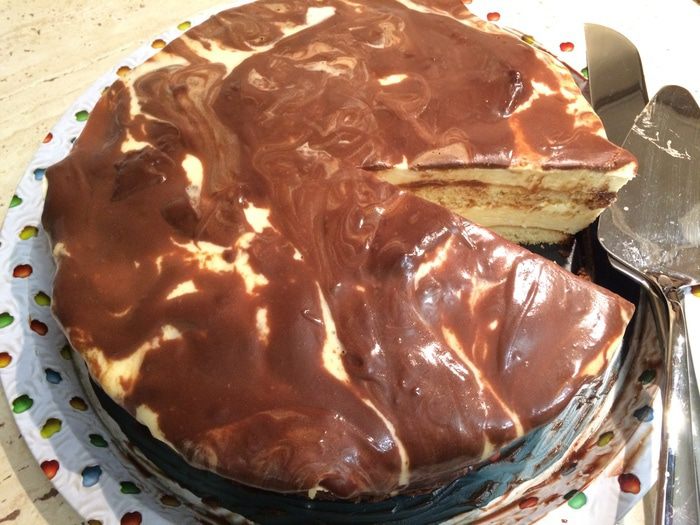 11. Вынимаем торт из холодильника, освобождаем от формы и перекладываем на блюдо. Аккуратно покрываем поверхность шоколадной массой, так, чтобы получились "мраморные" разводы, затем возвращаем торт в холод на 1-2 часа. Торт "Птичье молоко" (мраморный)