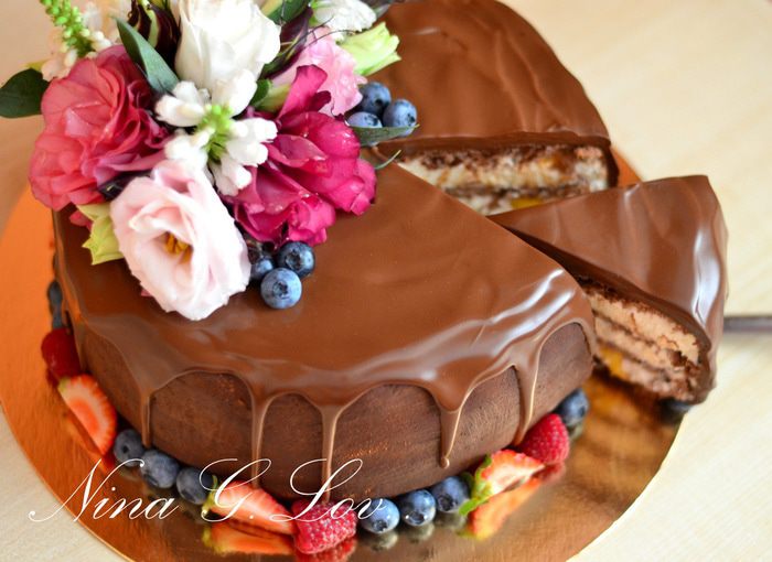 21. Украсить торт по желанию, я украсила живыми цветами и ягодами. Торт шоколадно-сливочный "Цветочная феерия"