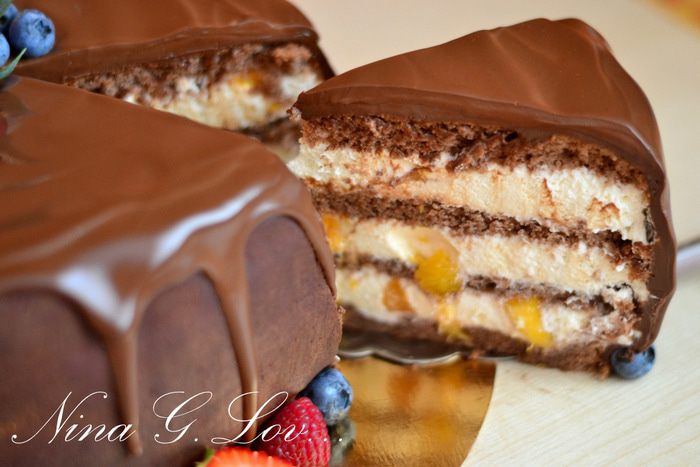 Привет всем! Давно не виделись)). Сегодня я хочу поделиться с Вами ну очень простым и безумно вкусным рецептом моего на сегодняшний день любимого торта. Он настолько прост в приготовлении, что, я думаю, любая хозяйка справиться с этим заданием на отлично. В основе торта шоколадный, очень нежный бисквит с потрясающе вкусным, нежнейшим кремом и фруктами, возможно любые Вами любимые ягоды. Я же  готовила этот торт и с клубникой, черникой, на данный момент с персиками и бананом. По поводу декора здесь я конечно отнеслась очень ответсенно, так как торт я представляю на конкурс, поэтому декор соответствует тематике. Вы же можете украсить его сливками и ягодками, будет по-летнему очень вкусно. А еще этот торт настолько не утежеляет Ваш желудок, что после праздничного застолья, кусочек торта будет очень даже кстати! Приятного!