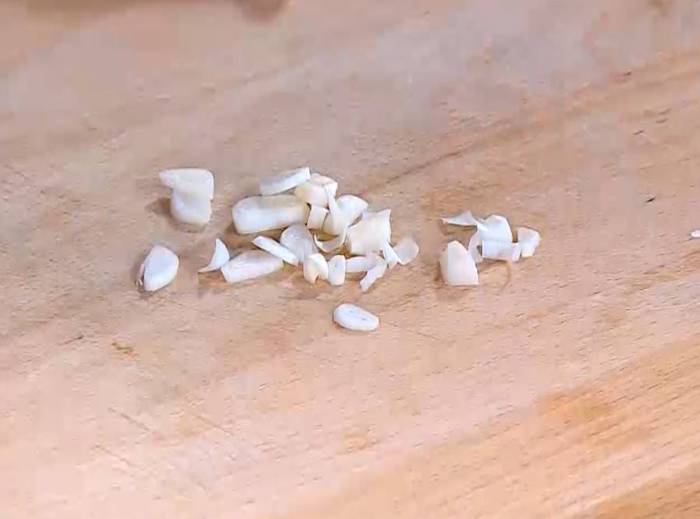 2. Один зубчик чеснока почистить, раздавить плоской стороной ножа и мелко порубить. Тосты с индейкой и овощами