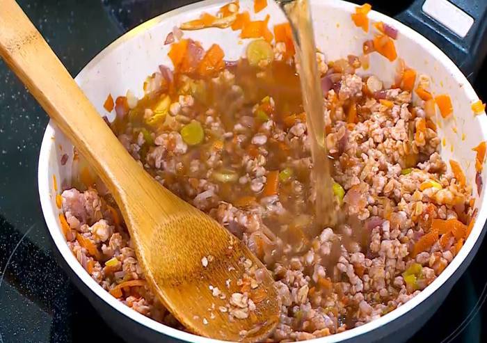 7. Добавить фарш и, постоянно помешивая, обжарить так, чтобы он посветлел. Тосты с индейкой и овощами