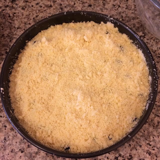 3. Крошку зрительно разделить на три части и распределить тесто по форме. Одну часть на дно, вторую на бока, а третью оставить для обсыпки. Творожный пирог с нектаринами