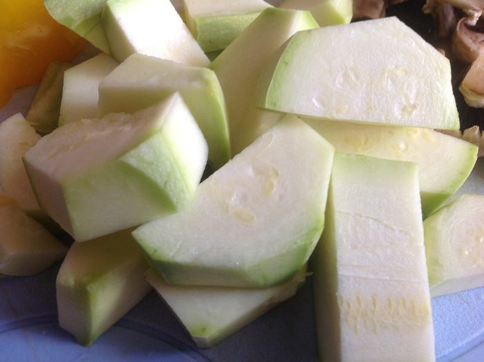 3. Нарежьте кабачки. Утиные ножки, запеченные с овощами