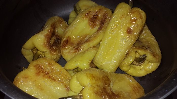 5. Готовые перцы выкладываем в кастрюлю и накрываем крышкой. Даем постоять 5 минут.