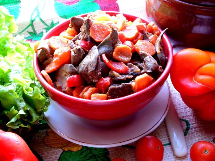 Печень в горшочке в сметанно-томатном соусе с овощами